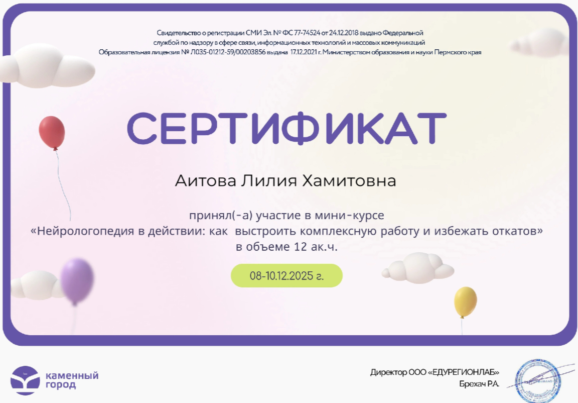 - 2022 г. – Оренбургский государственный педагогический университет, квалификация «Логопед-дефектолог».