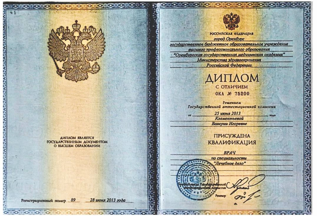 2007-2013 гг. – ГБОУ ВПО «Оренбургская государственная медицинская академия» Министерства здравоохранения Российской Федерации по специальности «Лечебное дело».