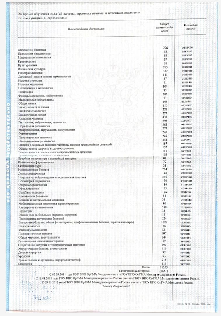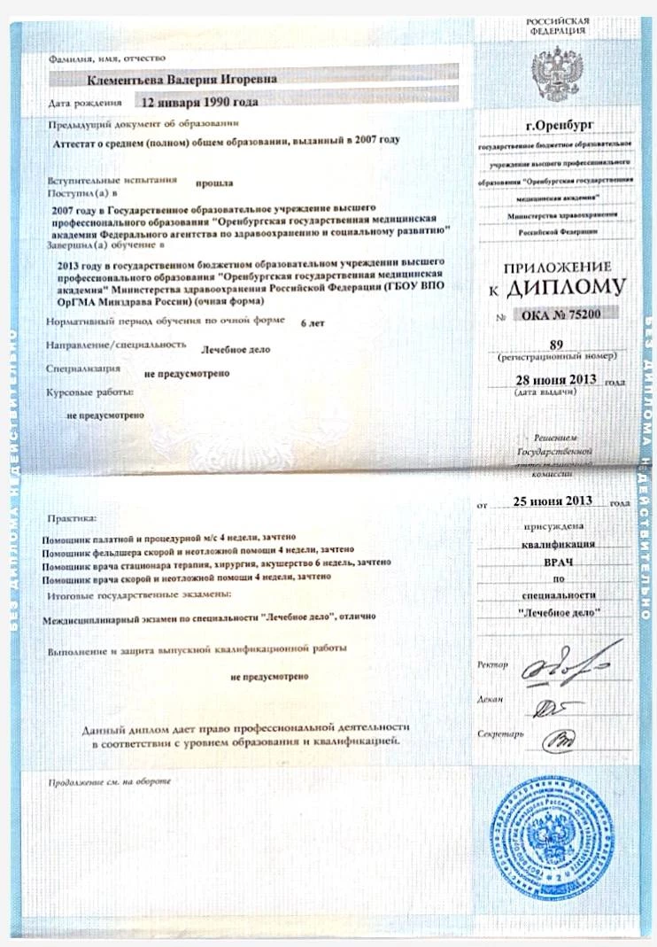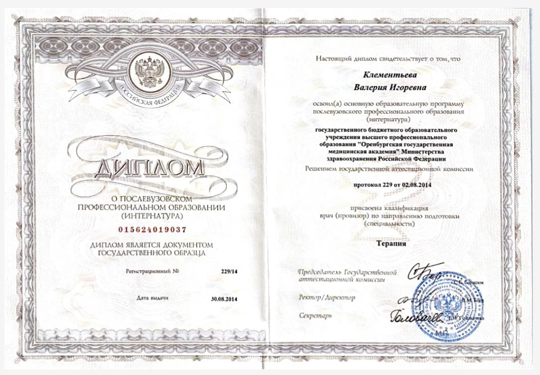 2013-2014 гг. – интернатура по специальности «Терапия» при ГБОУ ВПО «Оренбургская государственная медицинская академия» Министерства здравоохранения Российской Федерации.