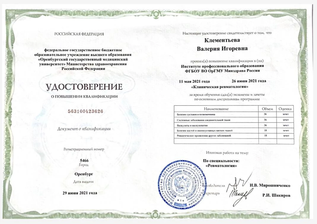 2021 г. – повышение квалификации по программе «Клиническая ревматология» (ФГБОУ ВО «Оренбургский государственный медицинский университет» Министерства здравоохранения Российской Федерации)
