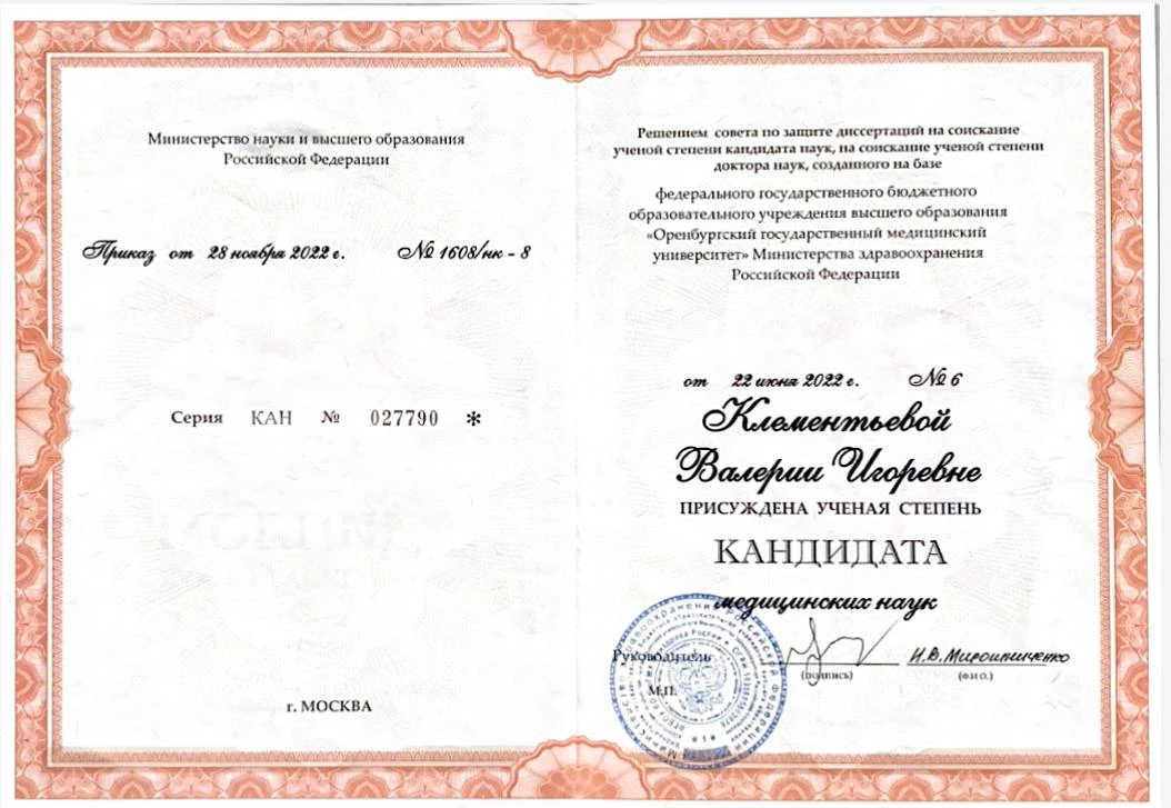 2022 г. – решением совета по защите диссертаций присуждена ученая степень кандидата медицинский наук