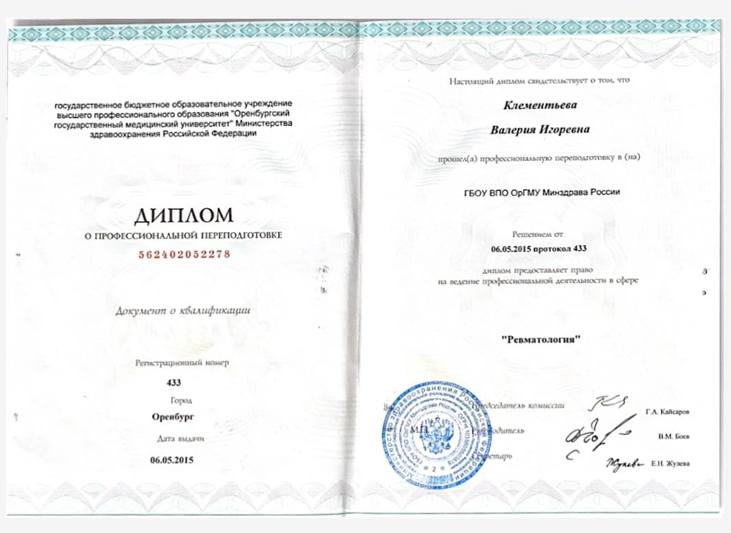 2015 г. – профессиональная переподготовка по специальности «Ревматология» (ФГБОУ ВО «Оренбургский государственный медицинский университет» Министерства здравоохранения Российской Федерации)
