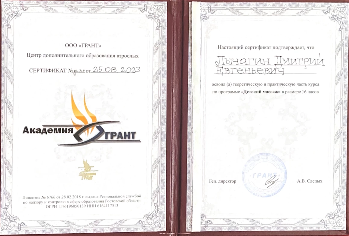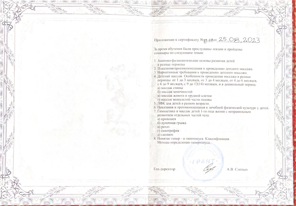 2023 г. – практический курс «Детский массаж» Академии массажа «Грант» (ООО «Грант»)