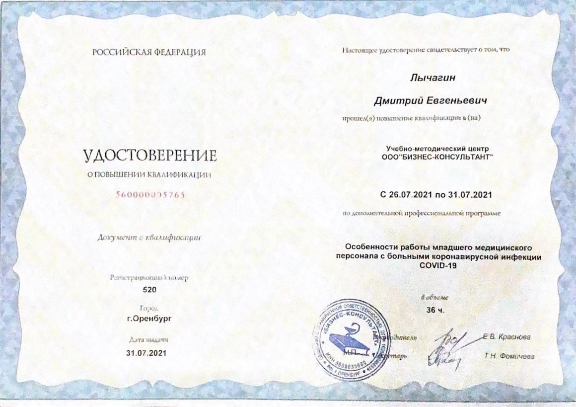 2021 г. – повышение квалификации по программе «Особенности работы младшего медицинского персонала с больными коронавирусной инфекции COVID-19» (Учебно-методический центр ООО «Бизнес-консультант»)