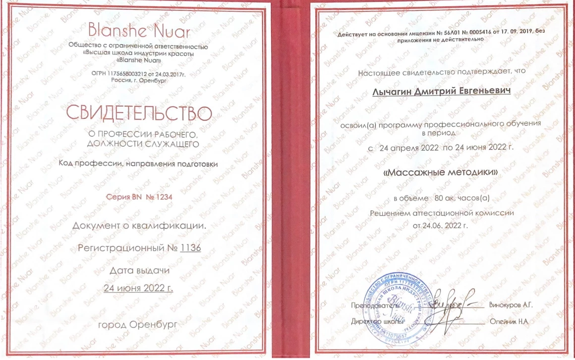 2025 г. – массажист Клиники доктора Маннанова (ООО «Линия Здоровья»)