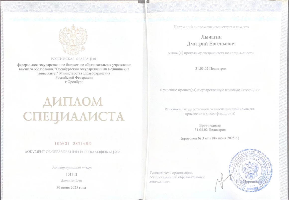 2019 – 2025 г. – окончил ФГБОУ ВО «Оренбургский государственный медицинский университет» Министерства здравоохранения Российской Федерации по специальности «Педиатрия».