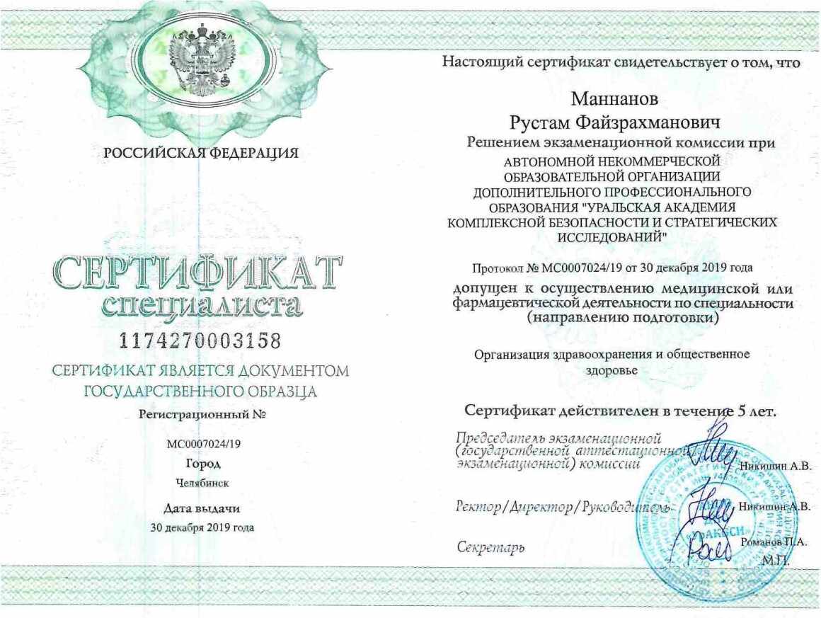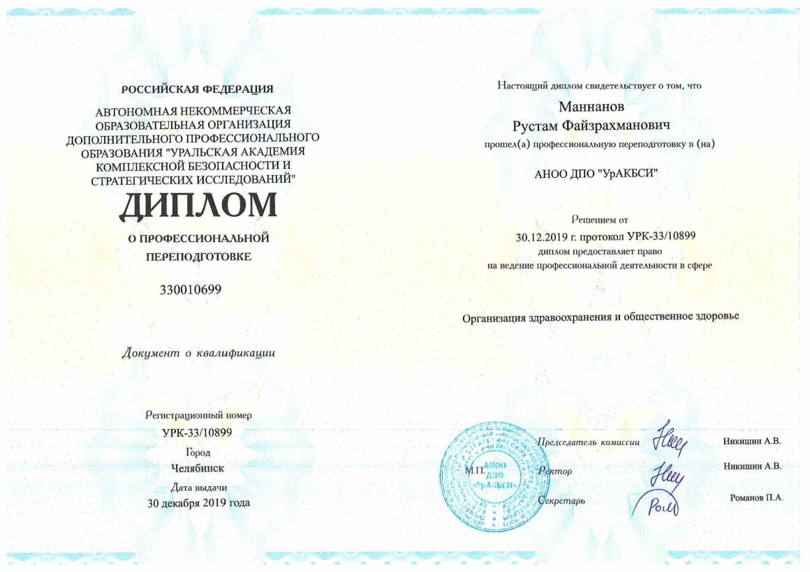 • 2020 г. – ООО «БВ», профессиональная подготовка по специальности «Психиатрия-наркология».
