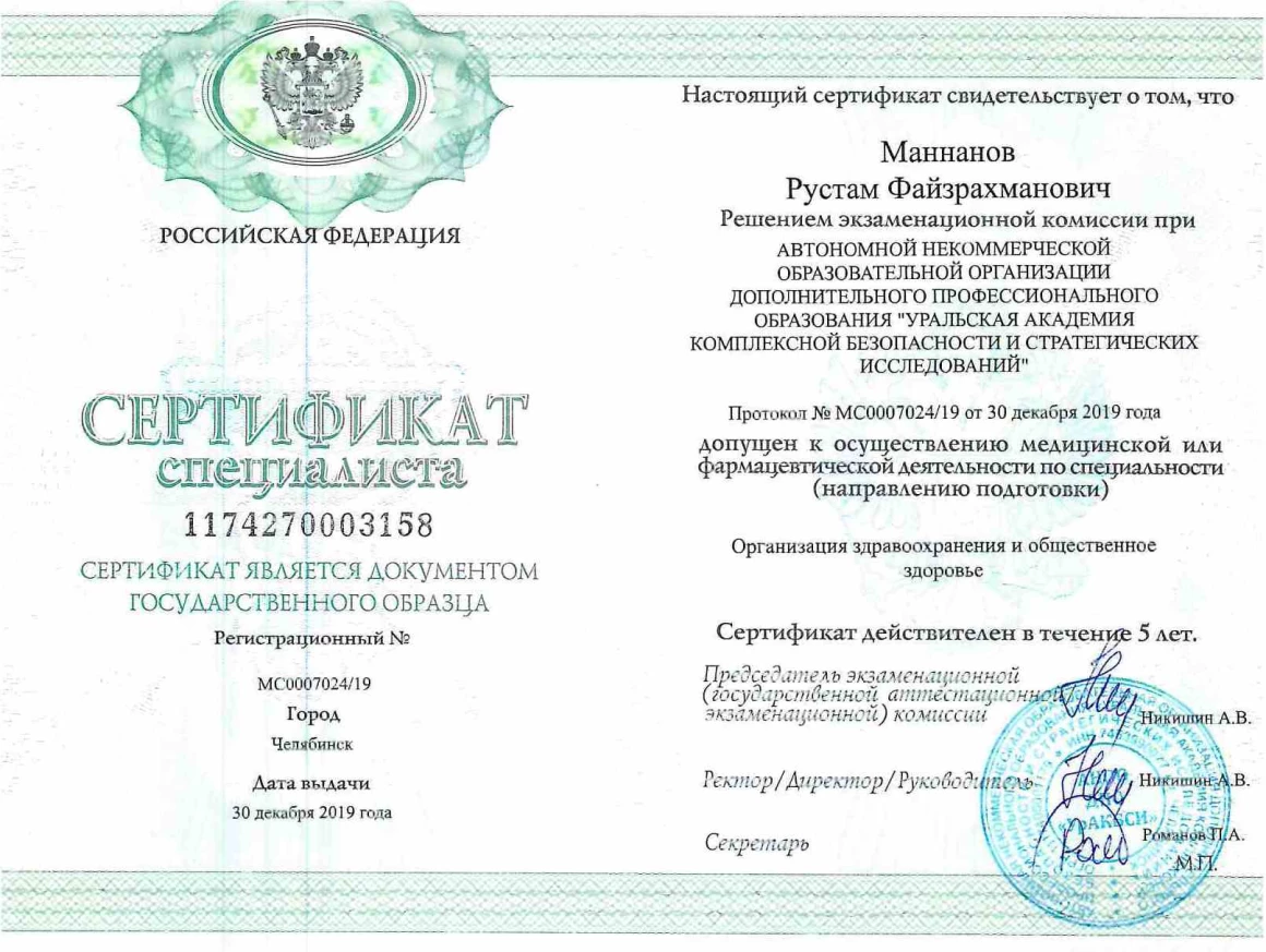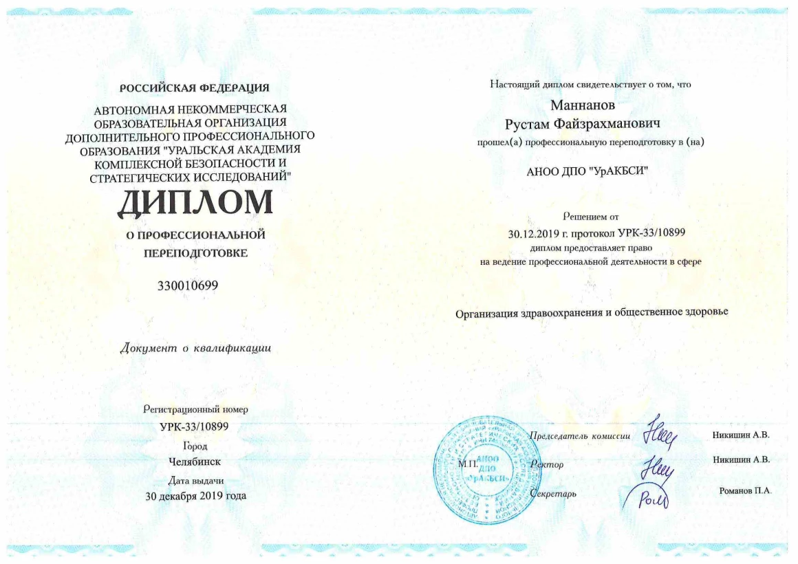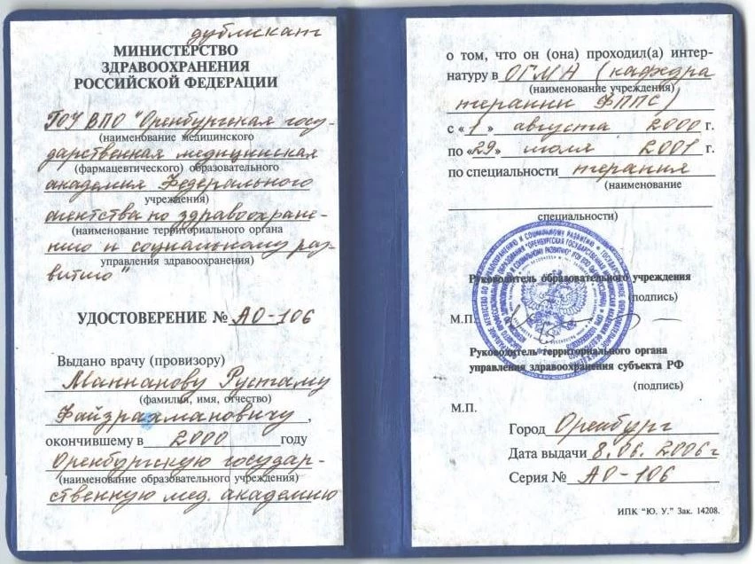 • 2000 г. – Оренбургская государственная медицинская академия, лечебный факультет.