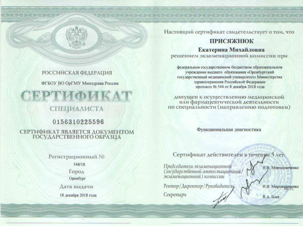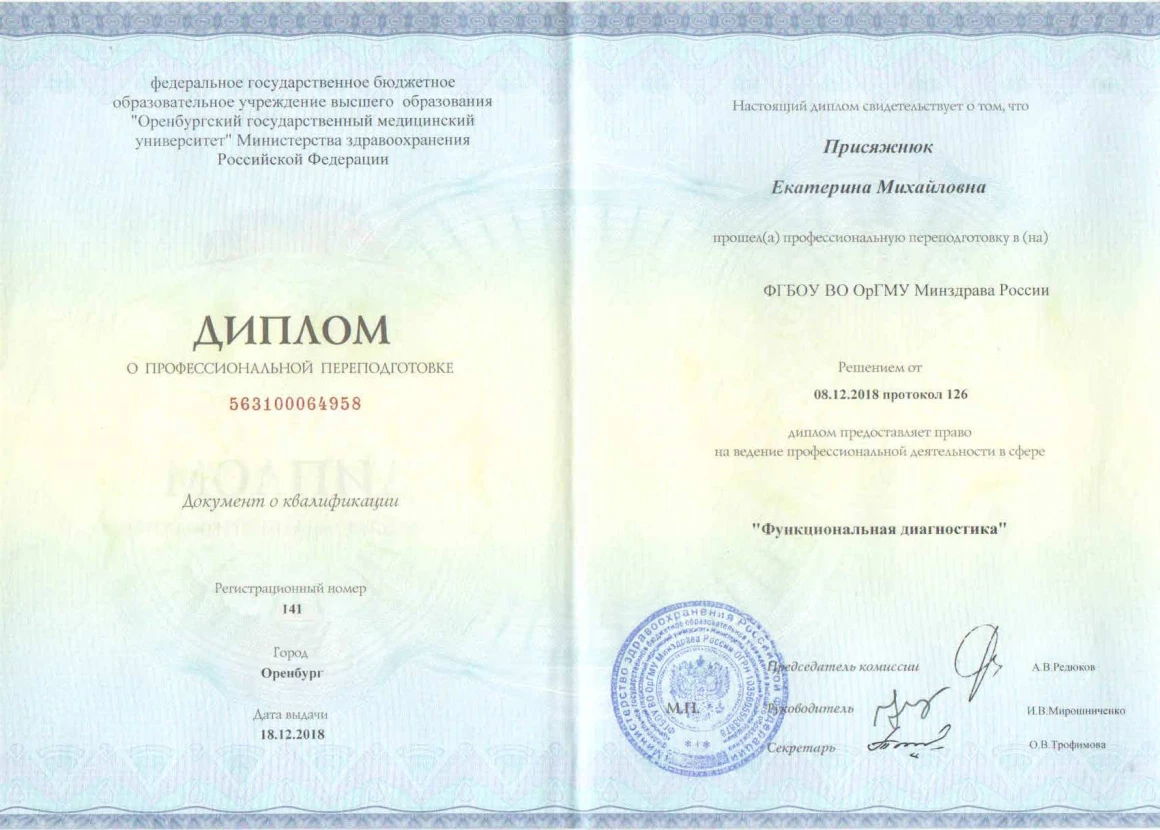 - 2018 г. Первичная специализация по специальности функциональная диагностика - федеральное государственное бюджетное образовательное учреждение высшего образования «Оренбургский государственный медицинский университет» Министерства здравоохранения Российской Федерации