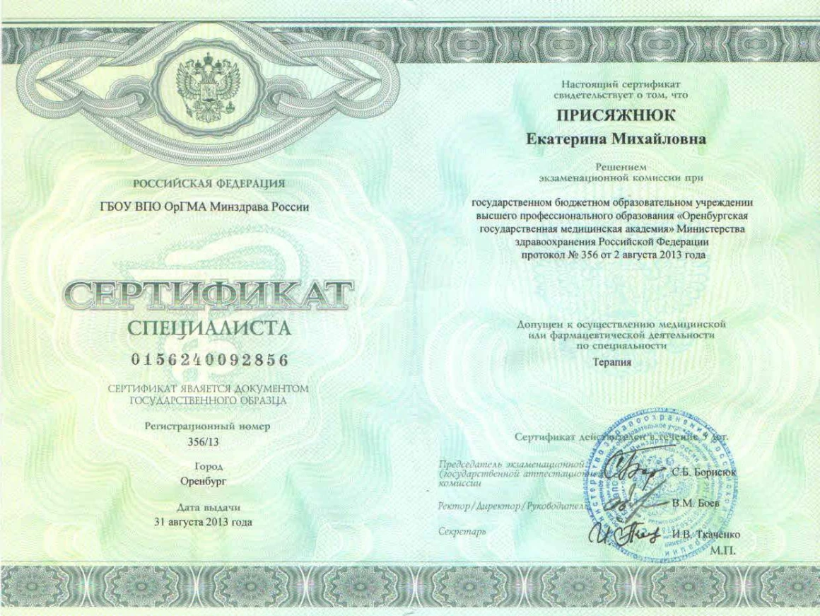 - 2014 г. Первичная специализация по специальности кардиология - федеральное государственное бюджетное образовательное учреждение высшего образования «Оренбургский государственный медицинский университет» Министерства здравоохранения Российской Федерации