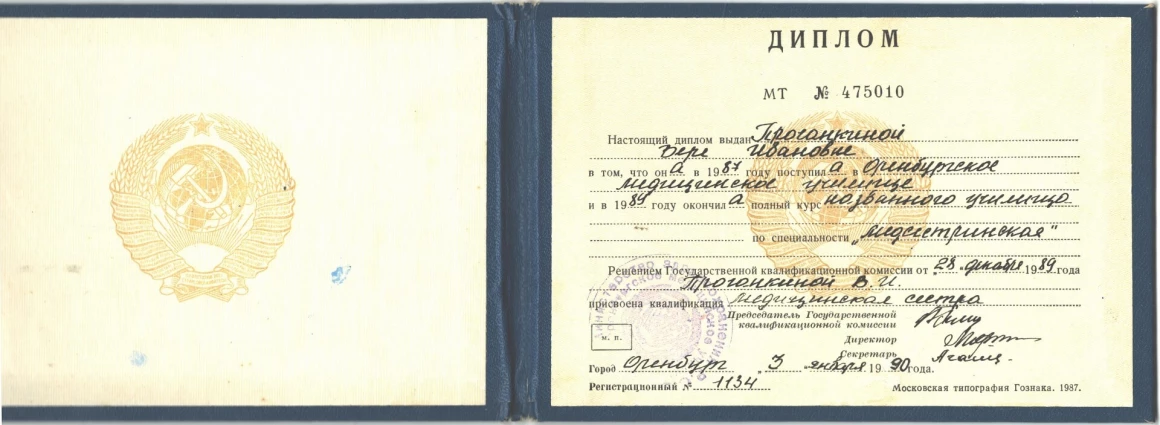 - 1990 г. – Оренбургское медицинское училище, «Сестринское дело».