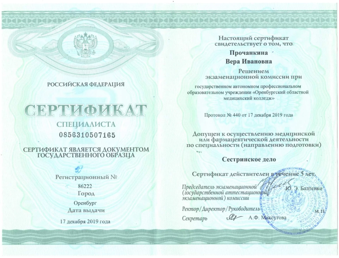 - 2019 г. – сертификат «Сестринское дело», Оренбургский областной медицинский колледж.