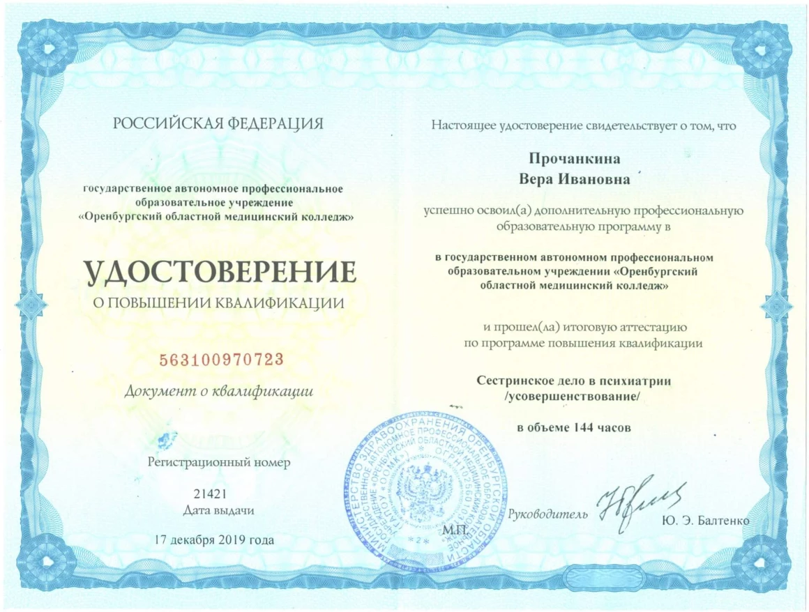 - 2015 г. и 2019 г. – повышения квалификации «Сестринское дело в психиатрии», Оренбургский областной медицинский колледж.