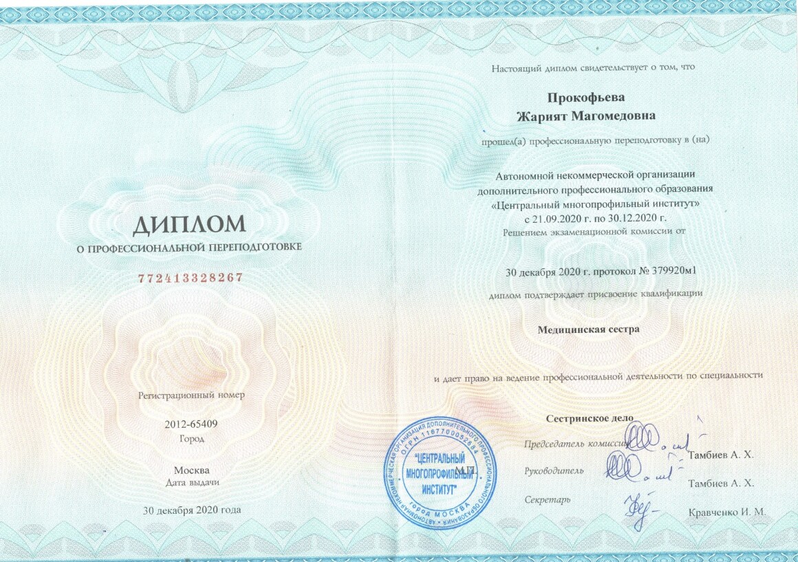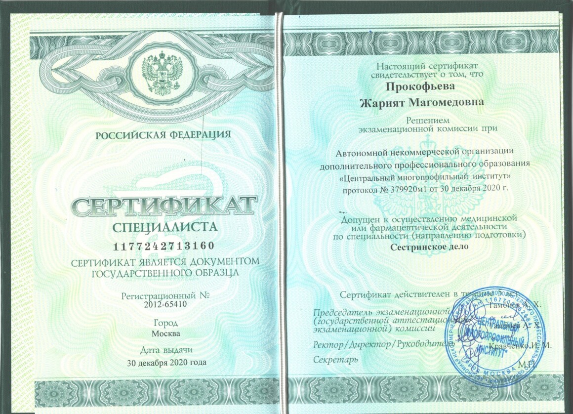 2020 г. – сертификат специалиста о допущении к осуществлению медицинской или фармацевтической деятельности по специальности (направлению подготовки) «Сестринское дело» (АНО ДПО «Центральный многопрофильный институт»).