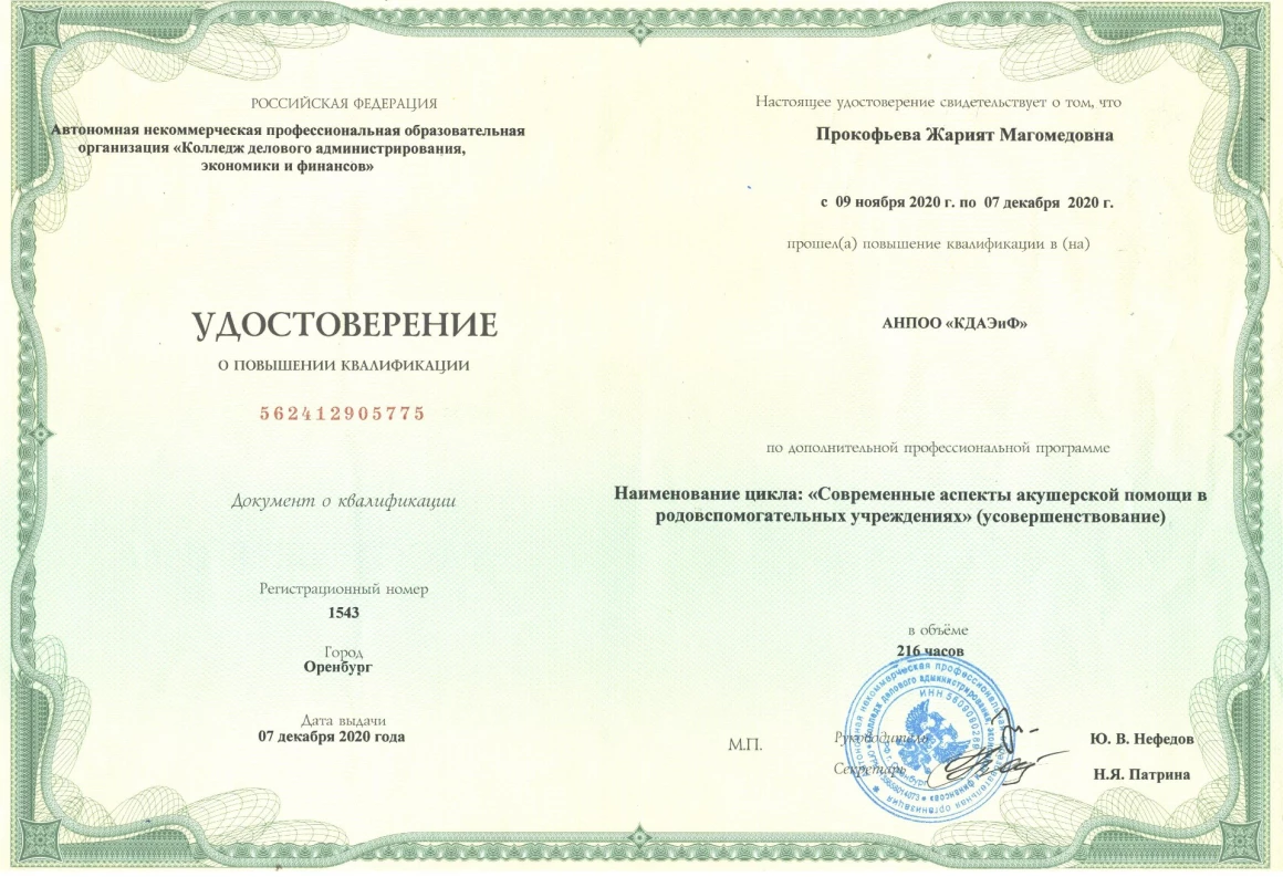 2020 г. – повышение квалификации по дополнительной профессиональной программе «Современные аспекты акушерской помощи в родовспомогательных учреждениях (усовершенствование)» (АНПОО «КДАЭиФ»)