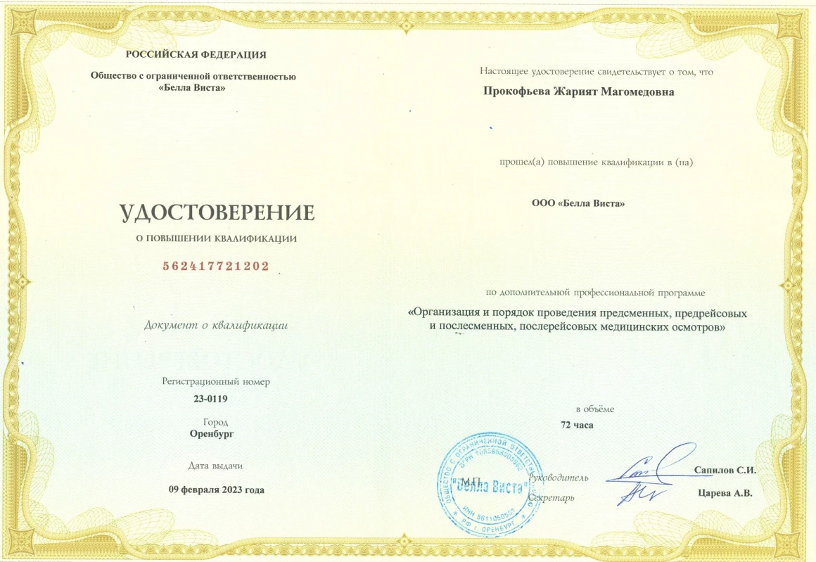 2023 г. – повышение квалификации по дополнительной профессиональной программе «Организация и порядок проведения предсменных, предрейсовых и послесменных, послерейсовых медицинских осмотров» (ООО «Белла Виста»).