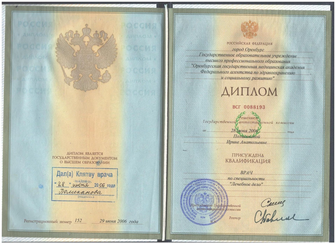 - 2000-2006 гг. – Оренбургская государственная медицинская академия, «Лечебное дело».