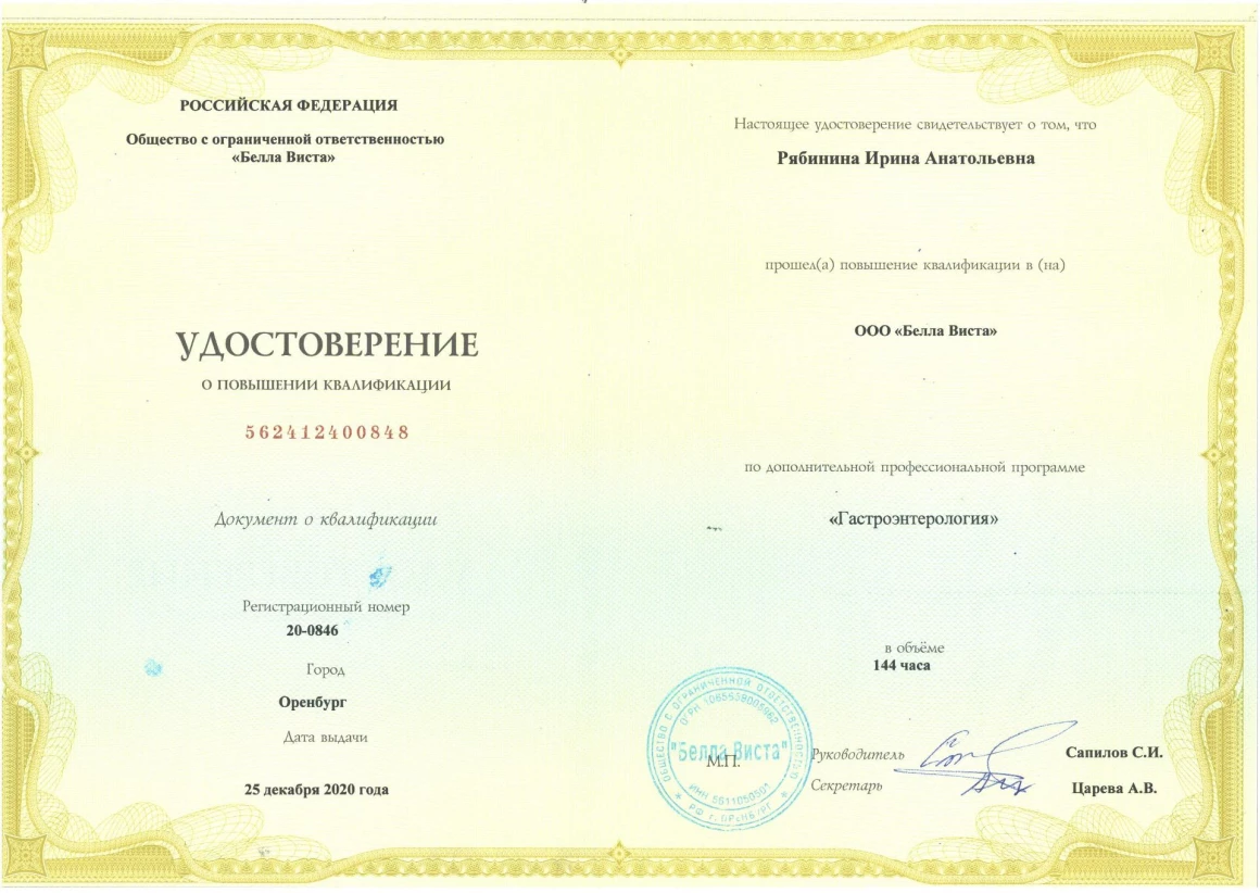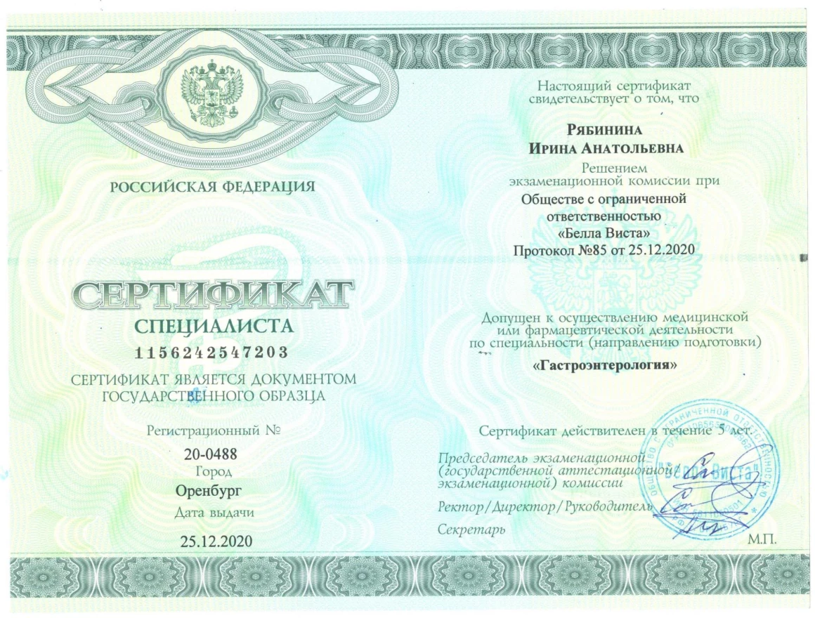 - 2020 г. – сертификационный цикл по специальности «Гастроэнтерология».