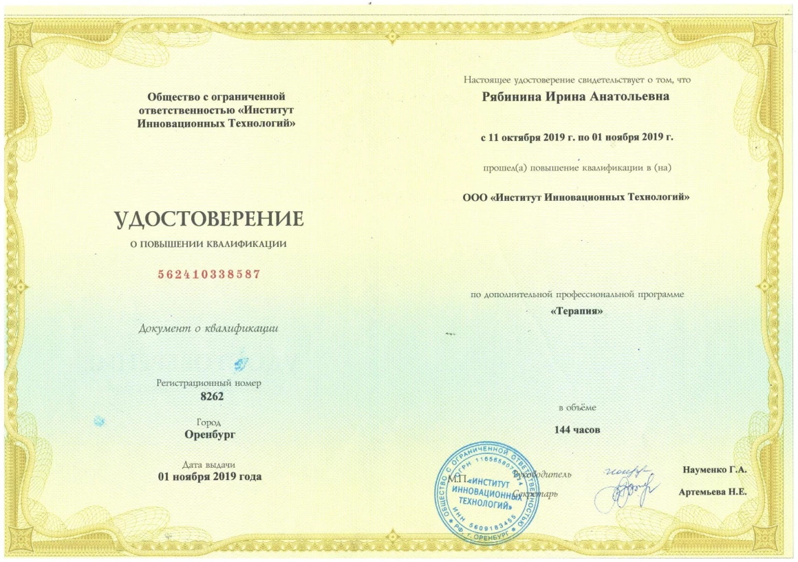 - 2019 г. – курсы повышения квалификации по профилю «Терапия».