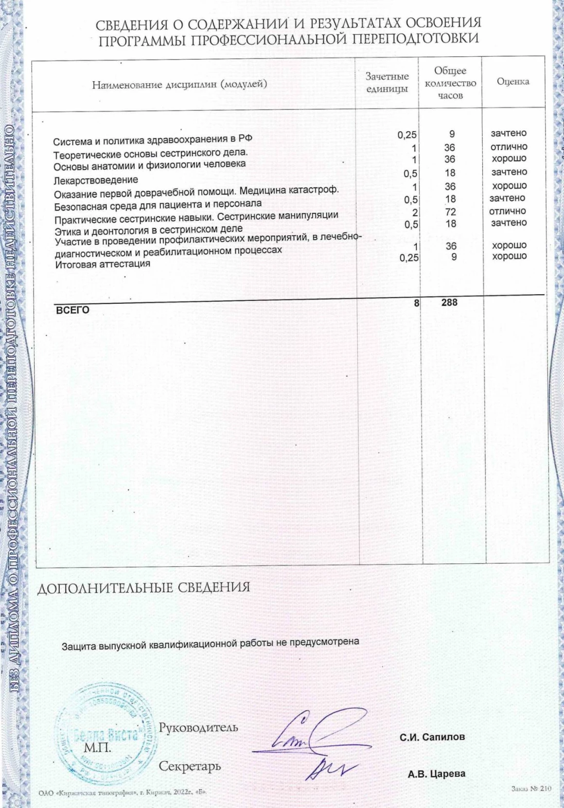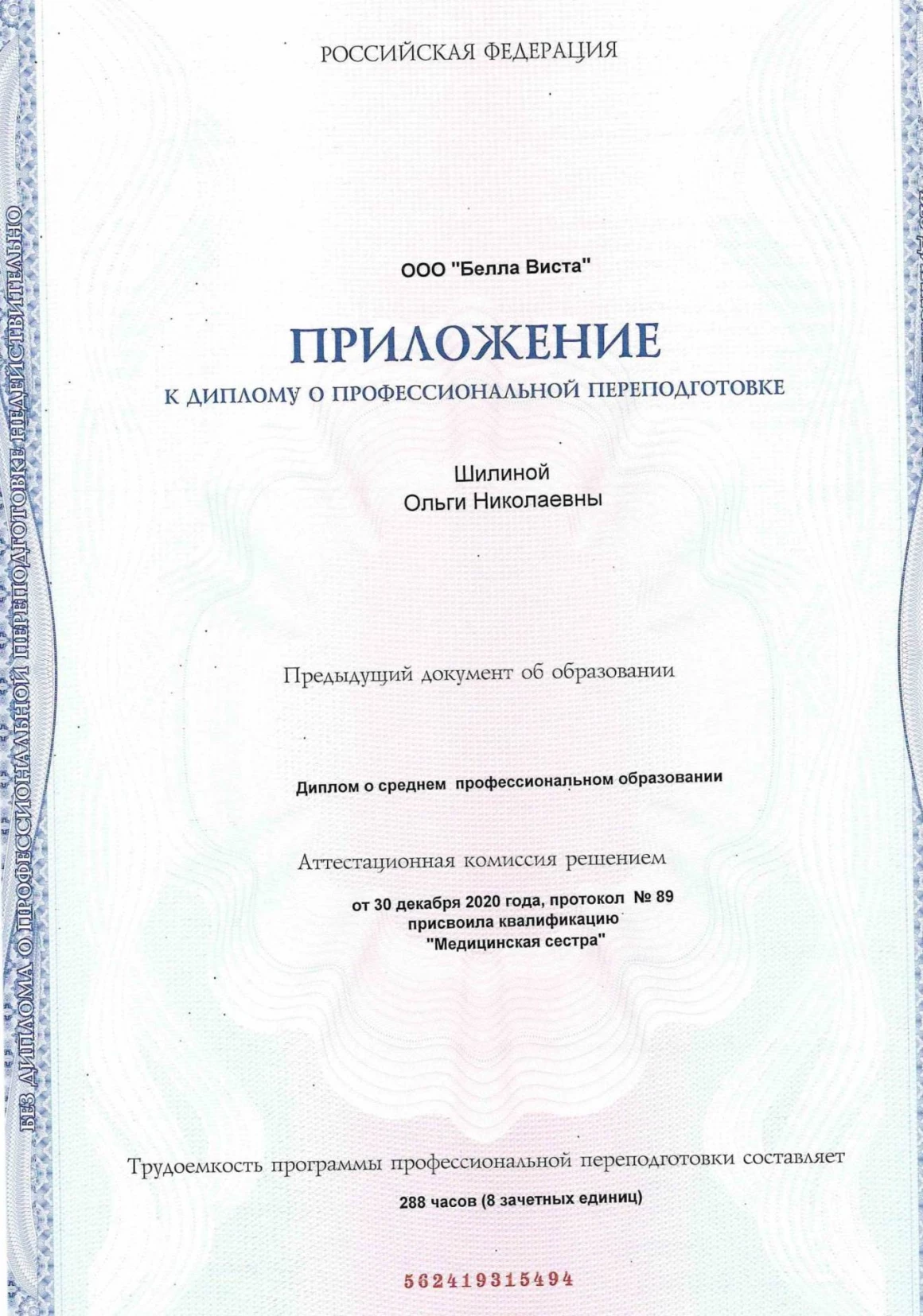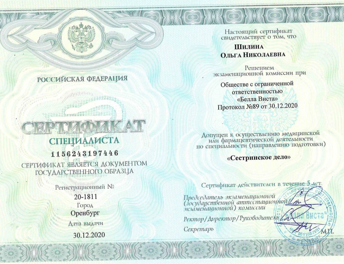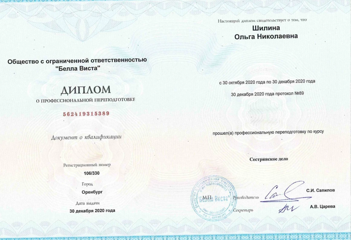 - 2020 г. – диплом о профессиональной переподготовке, сертификат специалиста «Сестринское дело»